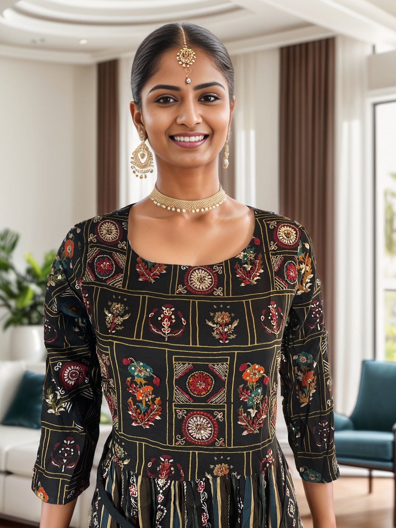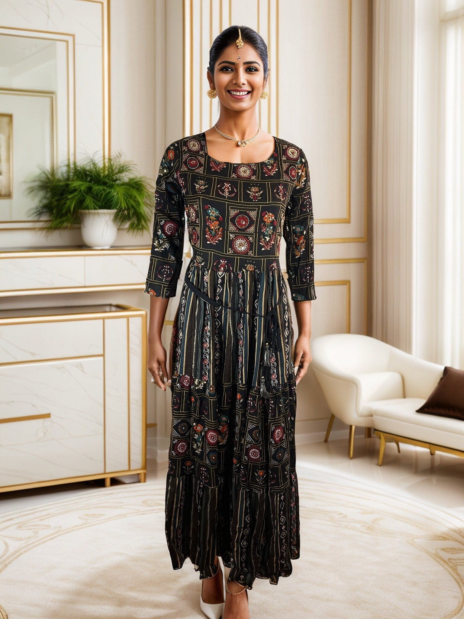 Elevate your wardrobe with this stunning Black Rayon Midi Dress, a perfect blend of tradition and contemporary style. Crafted from soft and breathable rayon, this dress features exquisite intricate patterns and delicate embroidery that add a touch of elegance and grace to your look.