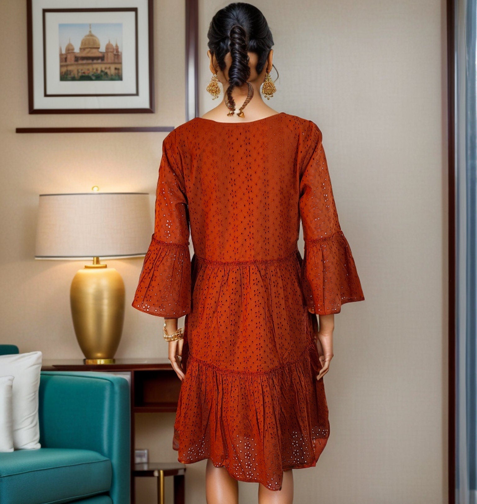Elegant and stunning Indian Rust color Schiffli Dress, a perfect blend of tradition and modern style. This beautiful dress is crafted from high-quality fabric, featuring intricate Schiffli embroidery that adds a touch of sophistication to the rich rust hue. The charming bell sleeves elevate the design, providing a graceful and flowy silhouette that's perfect for any occasion.