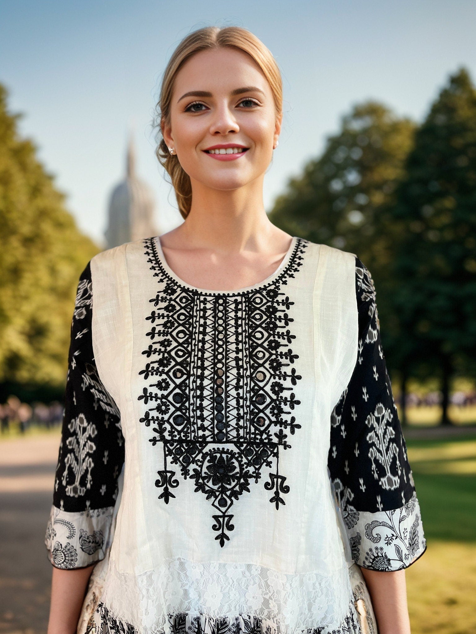 Design: The geometric embroidery, meticulously crafted by skilled artisans, lends a sophisticated and artistic flair to this tunic. The contrasting threads stand out beautifully against the deep white backdrop, creating a stunning visual effect.