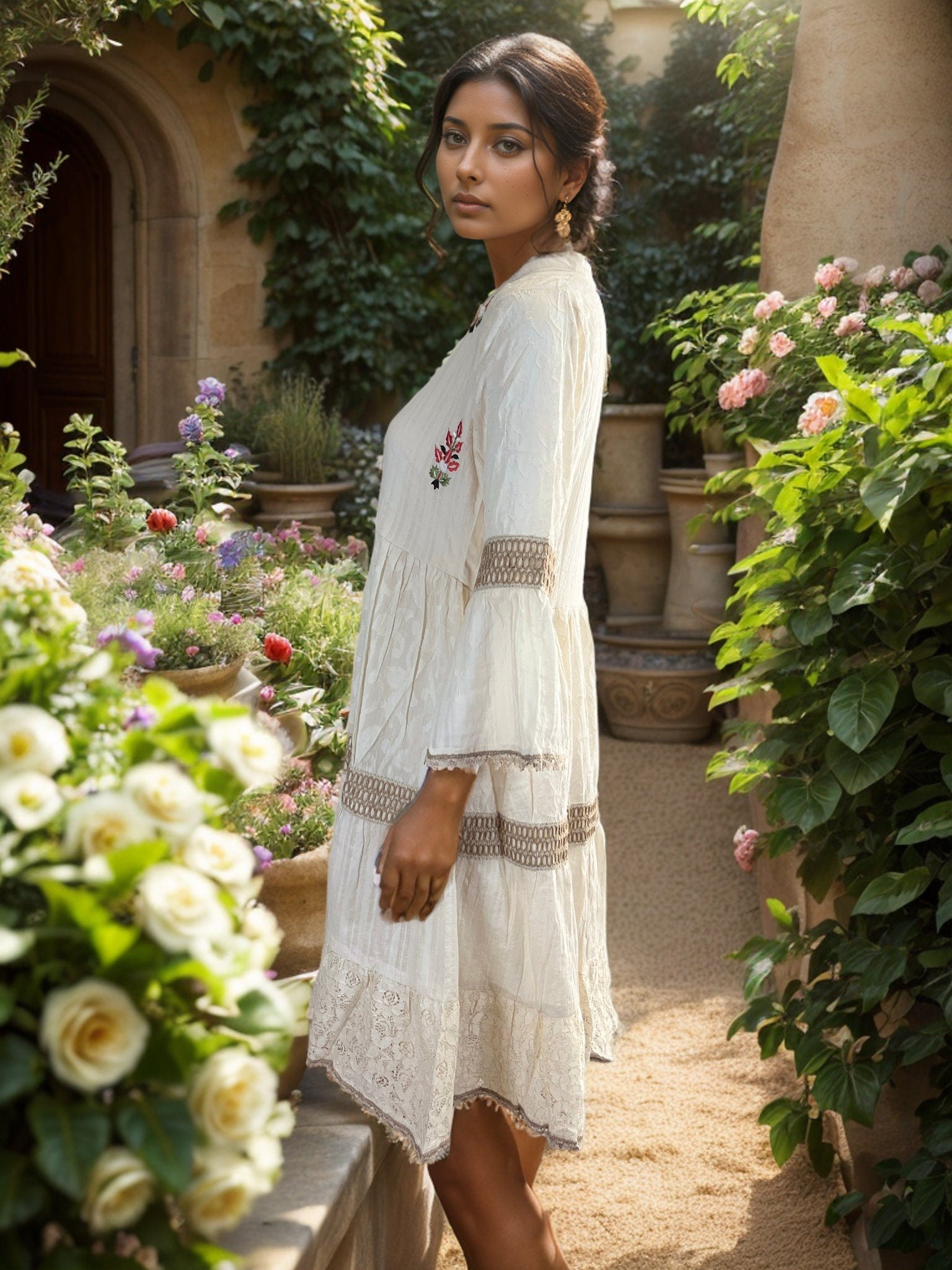 Elevate your wardrobe with this enchanting Cotton Bell Sleeves A-Line Dress, featuring intricate floral embroidery that exudes charm and elegance. Crafted from soft, breathable cotton, this dress offers comfort without compromising on style, making it the perfect choice for any occasion.