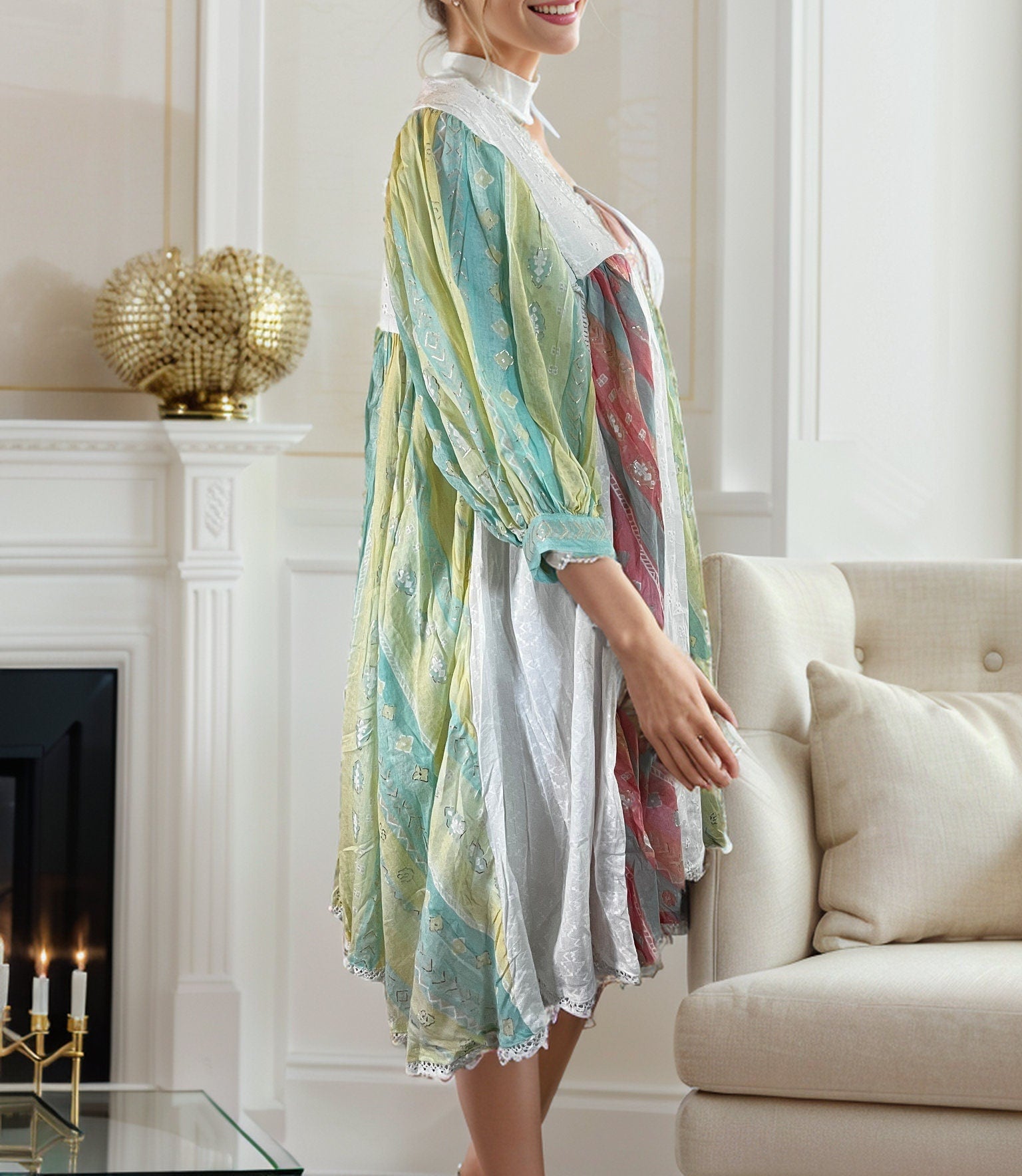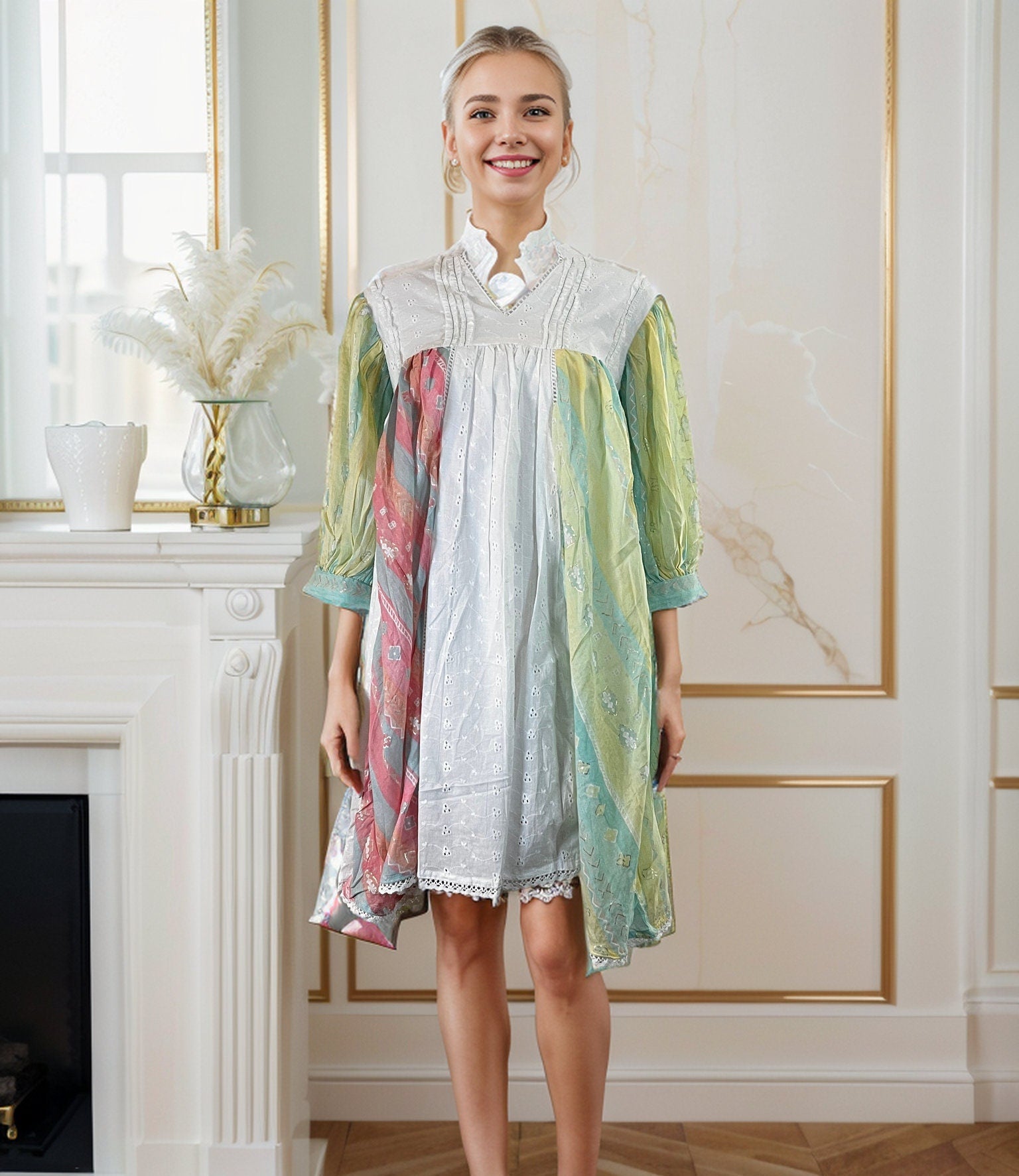 The dress is a harmonious blend of vibrant hues, bringing together the essence of Indian artistry. Each color seamlessly merges with the next, creating a lively and eye-catching pattern that‰۪s sure to turn heads. To enhance its elegance, delicate lace detailing has been meticulously added along the neckline, sleeves, and hemline, adding a touch of sophistication and charm.